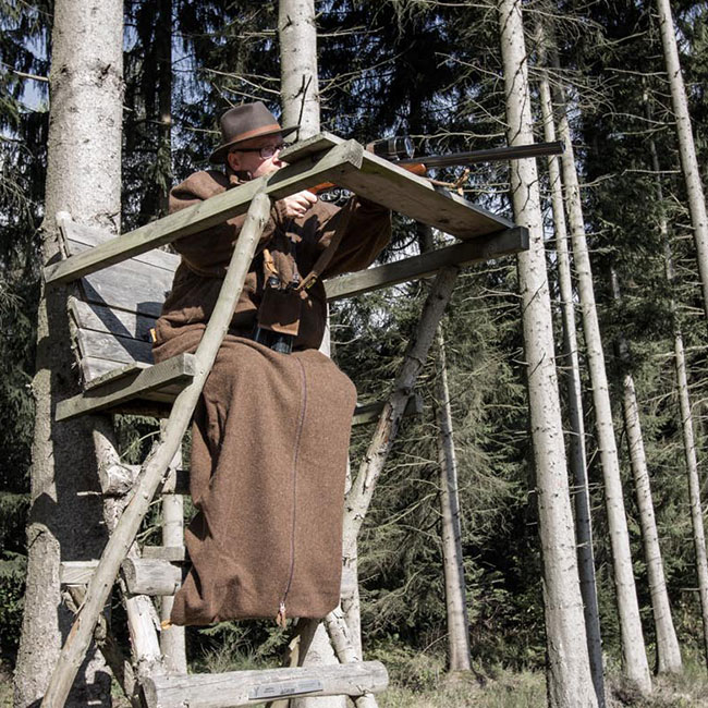 Wenn Sie"eingestiegen" sind und ihn mithilfe des Reißverschlusses geschlossen haben, können Sie einfach das Fußteil von unten wieder öffnen und im Hüftbereich an dafür vorgesehenen Lederhaken befestigen. Zugegeben, es sieht ein wenig unmodisch aus und der Schnitt ist eher als ausladend zu bezeichnen, aber Sie sollen damit ja auch nicht Ihre Frau zum Dinner ausführen. Der wahre Wert wird Ihnen dafür auf den ersten Schritten sofort klar: Sie können laufen und tragen den PETZ nicht als Ballast durch den Wald, sondern als vollwertigen Mantel! Darüber können Sie ganz normal den Jagdrucksack tragen, die Waffe schultern und sich wie gewohnt bewegen. Am nächsten Hochsitz angekommen, lösen sie das Fußteil wieder, stecken die Füsse hinein und schliessen den Reißverschluss – sofort breitet sich wieder Wärme im Inneren aus.