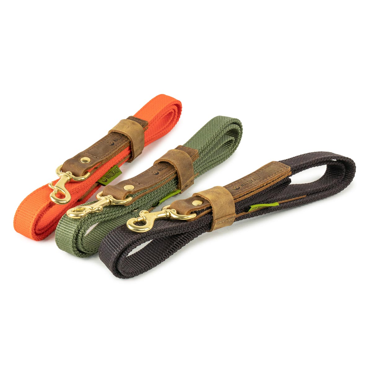 Die Leine ist aus doppelt gelegtem, vernähtem Gurtband gefertigt. Die Handschlaufe aus 1-fachem Gurtband legt sich geschmeidig um die Hand. Der Übergang zur Leine ist mit einem Lederbesatz aus Fettnubukleder vernäht und einer stabilisierenden Niete zusätzlich gesichert.