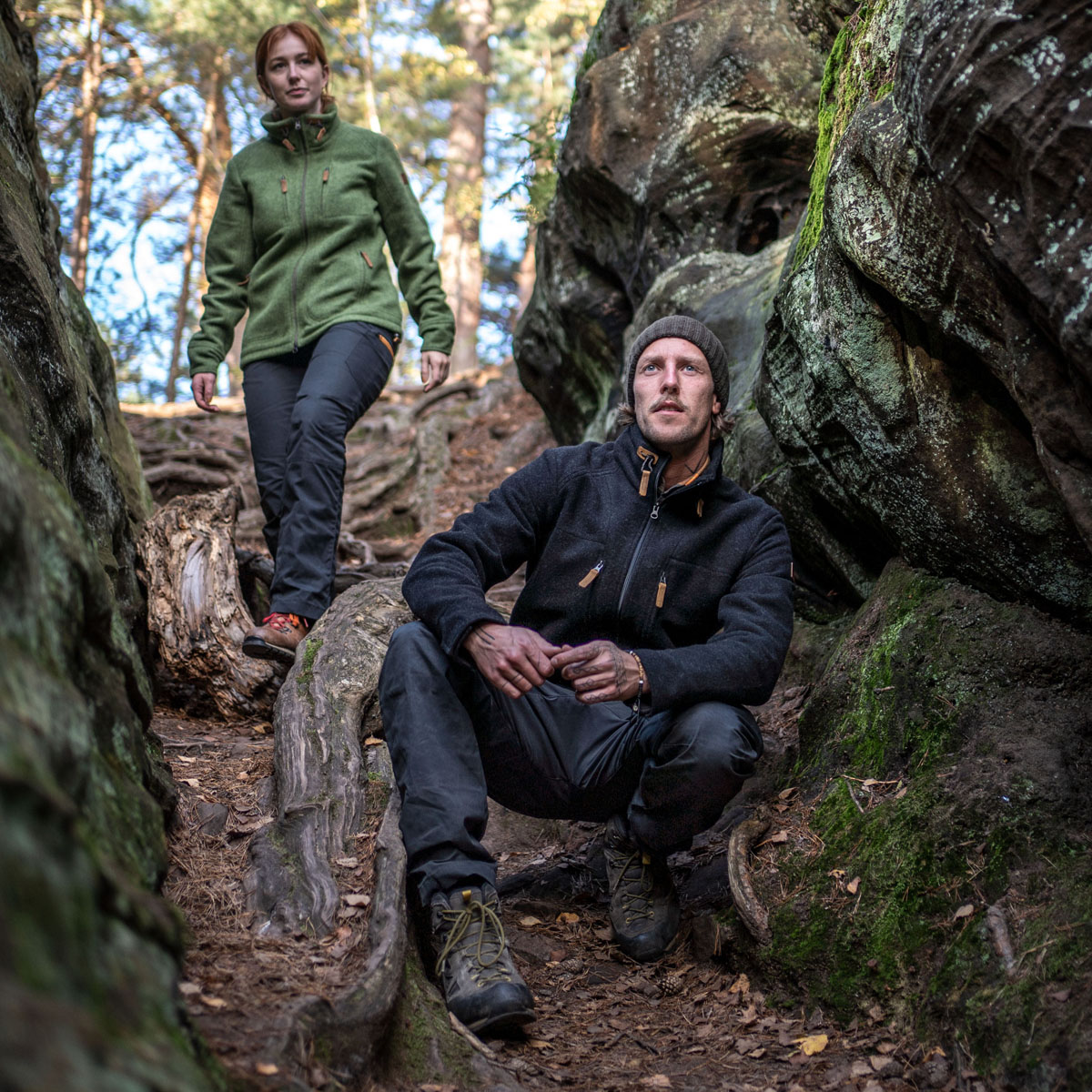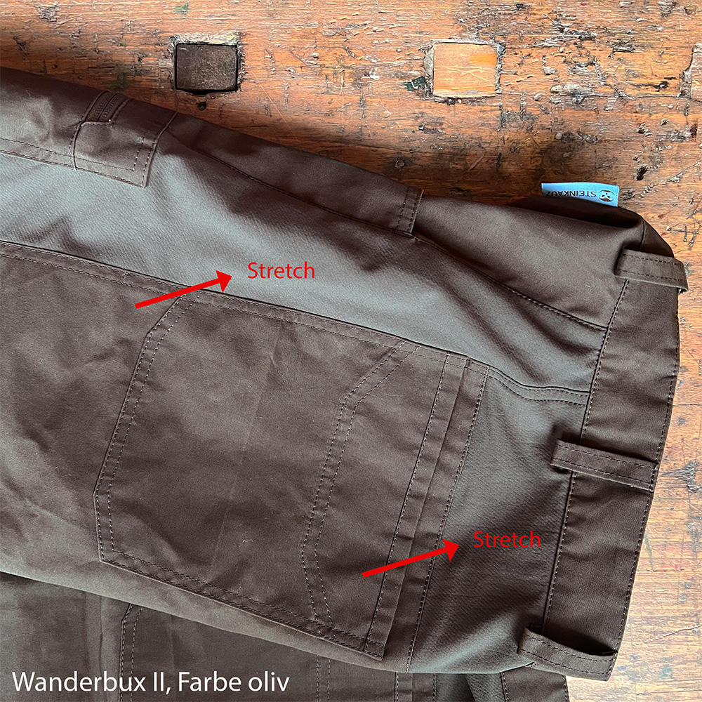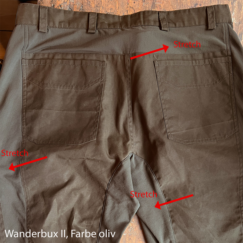 Wir haben unsere Wanderbux neu erfunden! Nach vielen Jahren in der Praxis haben wir alle Details noch mal auf den Prüfstand gestellt und eine ganz neue Generation unserer robusten aber leichten Outdoorhose entwickelt. Gerade bei Hüttentouren im unwegsamen Gelände kann man nicht genug Bewegungsfreiheit haben. Bei der Wanderbux II kommt daher wohldosiert – und nur dort, wo es wirklich einen spürbaren Effekt hat – stabiler 4-Wege-Stretch des europäischen Qualitätsproduzenten IBQ zum Einsatz. So haben wir das Maß an Bewegungsfreiheit enorm erhöht, und trotzdem die "roughe" Optik des gewachsten Mischgewebes (und damit optisch auch Ihre Alltagstauglichkeit) beibehalten können.