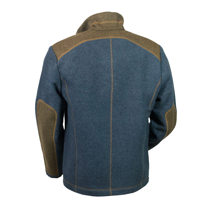 Die Jacke hat einen modernen Schnitt und bringt ausreichende Bewegungsfreiheit mit, so daß sie besonders während sportlicher Betätigung oder Outdoor-Aktivitäten angenehm zu tragen ist. Zwei große, mit echtem Leder eingefasste Reißverschlußtaschen bieten Platz für einige Utensilien und wärmen im Winter die Hände. Im Ellenbogen-, Schulter-, und Halsbereich haben wir den Oberstoff noch zusätzlich mit Belegen aus normalem Loden, ebenfalls aus reiner Schurwolle, verstärkt. So werden die stark beanspruchten Stellen zusätzlich gegen Abnutzung geschützt.