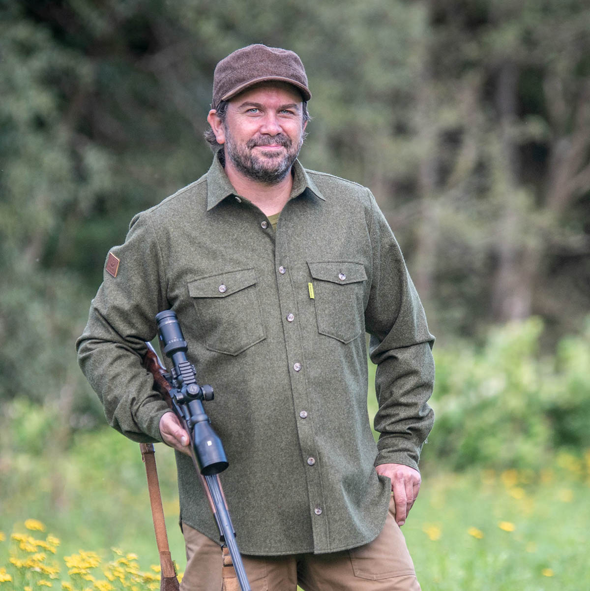 Das Wollhemd wird aus einem dünnen Loden (der aber immer noch weit dicker als die meisten Hemdenstoffe ist) aus deutscher Herstellung genäht. Die reine Merino-Schurwolle hält, wie man es auch von unseren übrigen Lodenprodukten kennt, warm, gleicht Feuchtigkeit aus und atmet dabei sehr gut. Der Schnitt ist leicht tailliert und eher körperbetont aber nicht zu eng. Man will sich ja schließlich auf der Jagd und beim Draussen sein bewegen können.Ist der Rumpf ein wenig zu knapp, lässt sich der Umfang durch das Auftrennen von zwei extra für diesen Zweck angelegten Rückennähten um ca. 4 cm erweitern. Das Hemd "Grimbart" hat zwei aufgesetzte Pattentaschen, einen Kentkragen und mit einem Knopf verschließbare Manschetten, damit es sich auch mit hochgekrempelten Ärmeln gut tragen lässt.