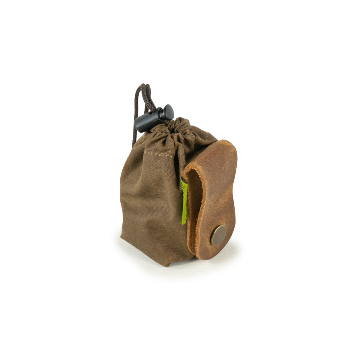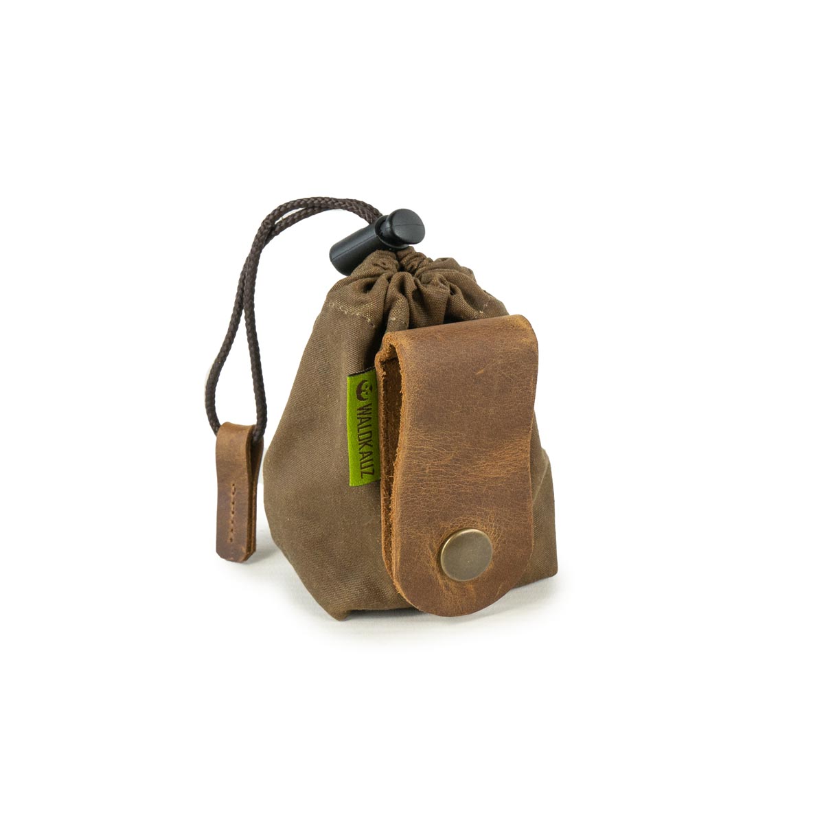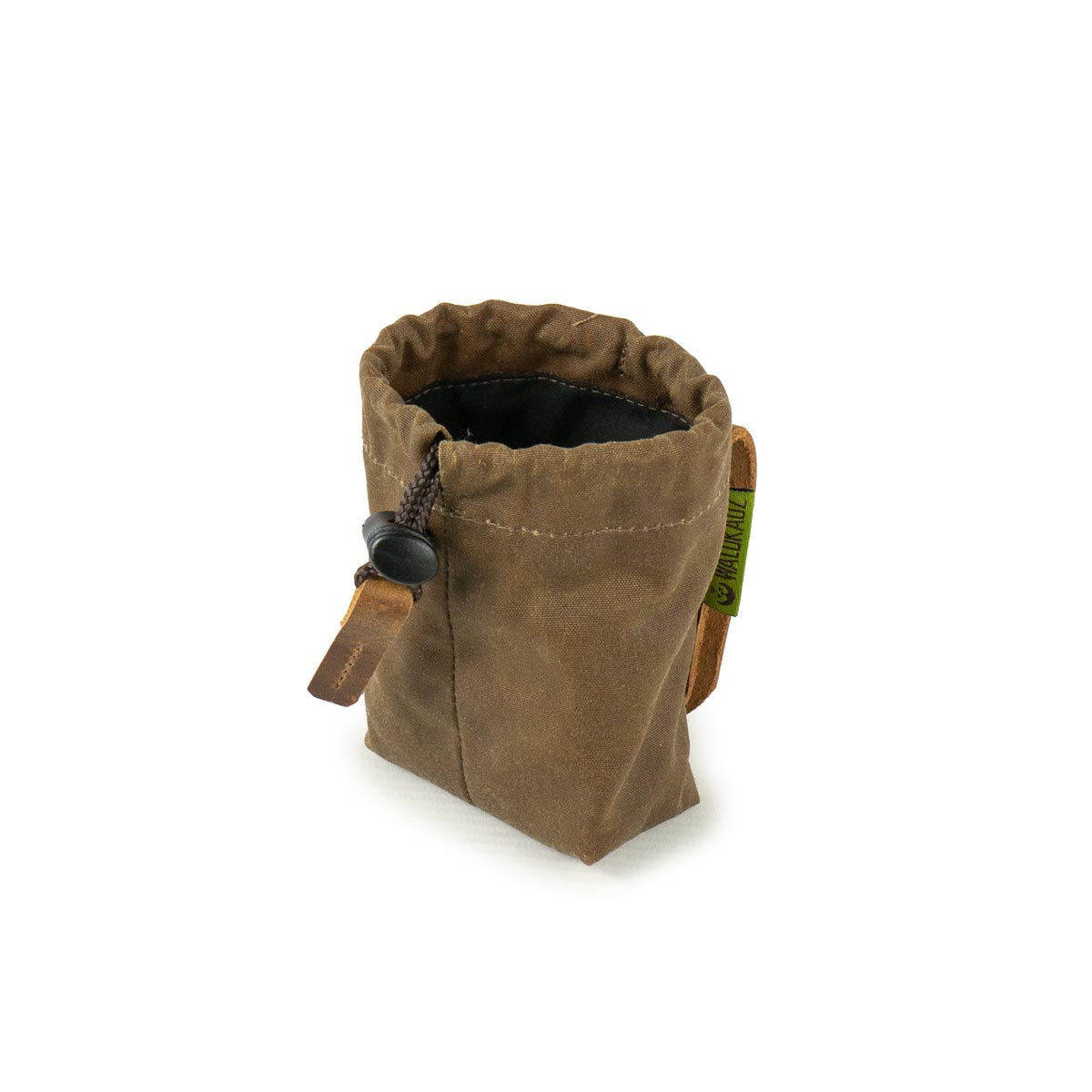 Auch dieser kleine Leckerchenbeutel wird aus britischem 8 Oz Waxed Cotton hergestellt und ist im Inneren zusätzlich gefüttert, damit das Hundefutter nicht mit dem gewachsten Stoff in Kontakt kommt. Ein Zugband mit Kordelstopper dient auch hier dem sichern Verschluß.