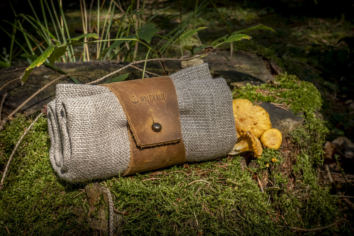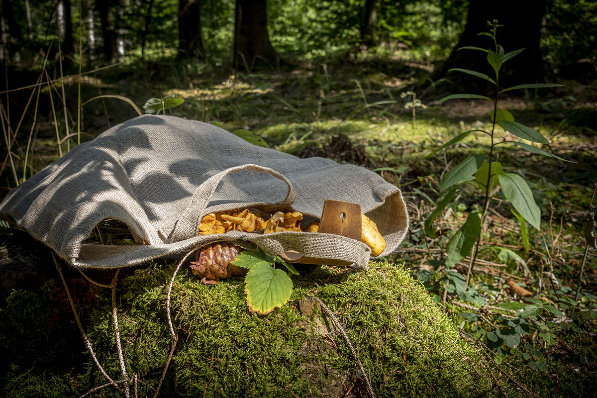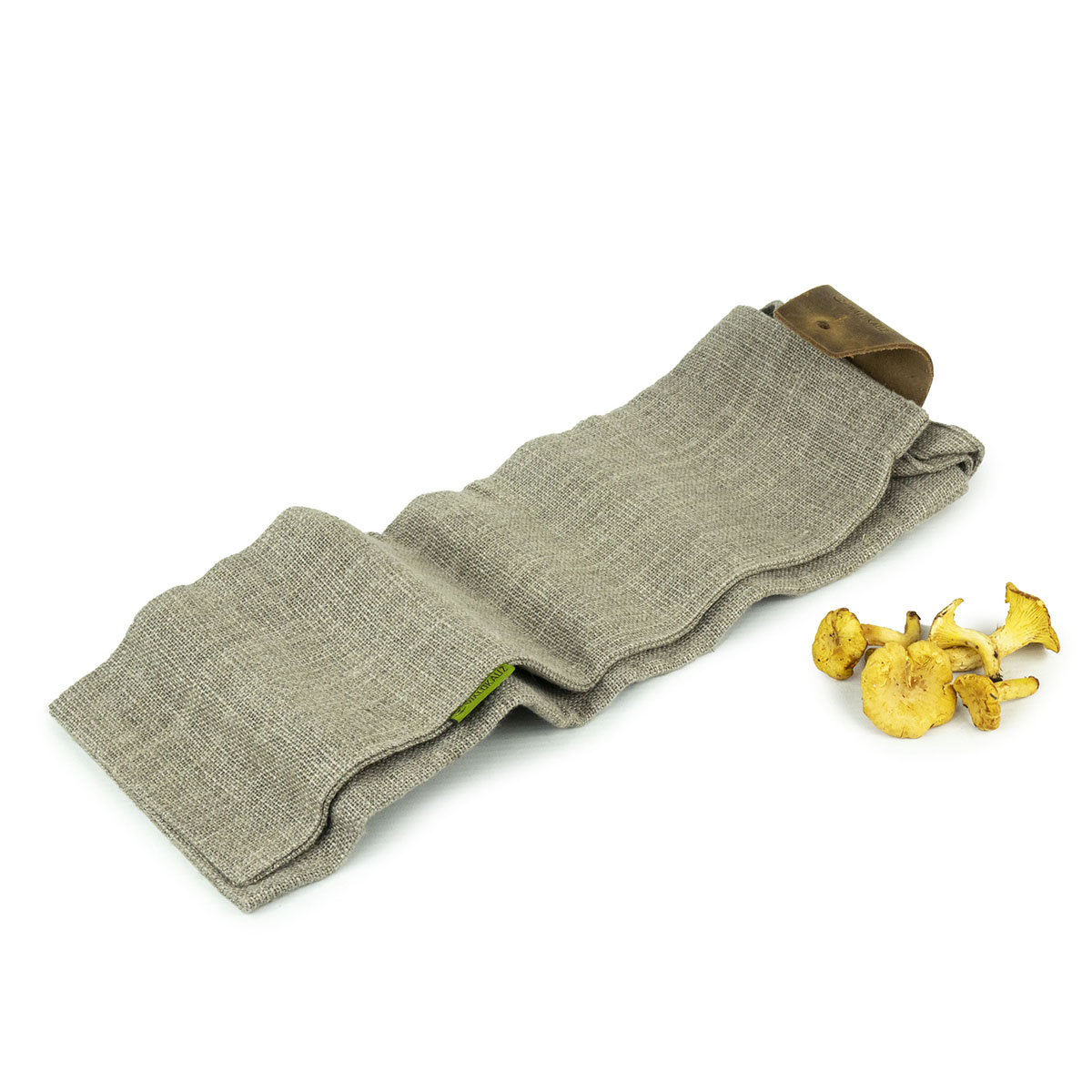 Kompakter als jeder Pilzkorb: Die Pilzsammeltasche "Mitbringsel" aus reinem Leinen und Leder