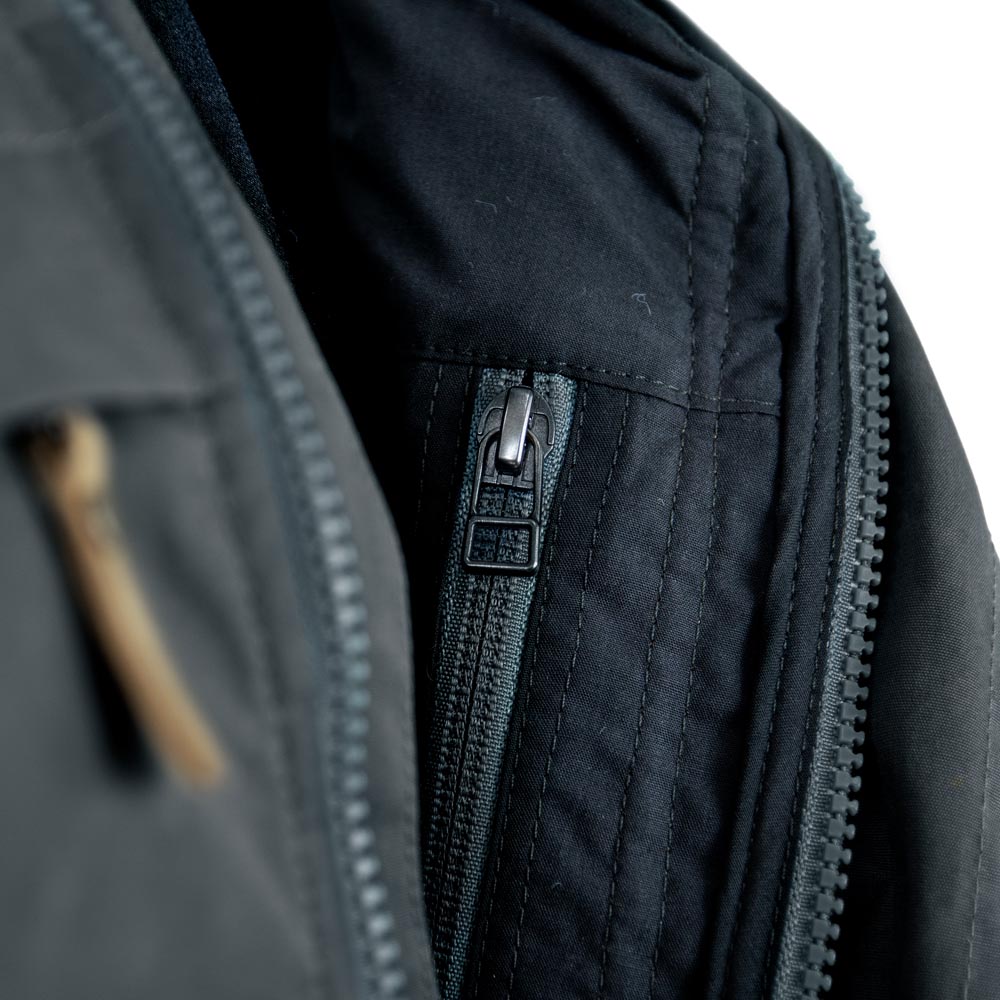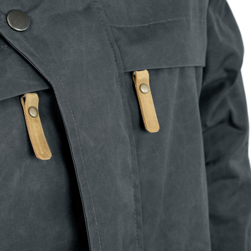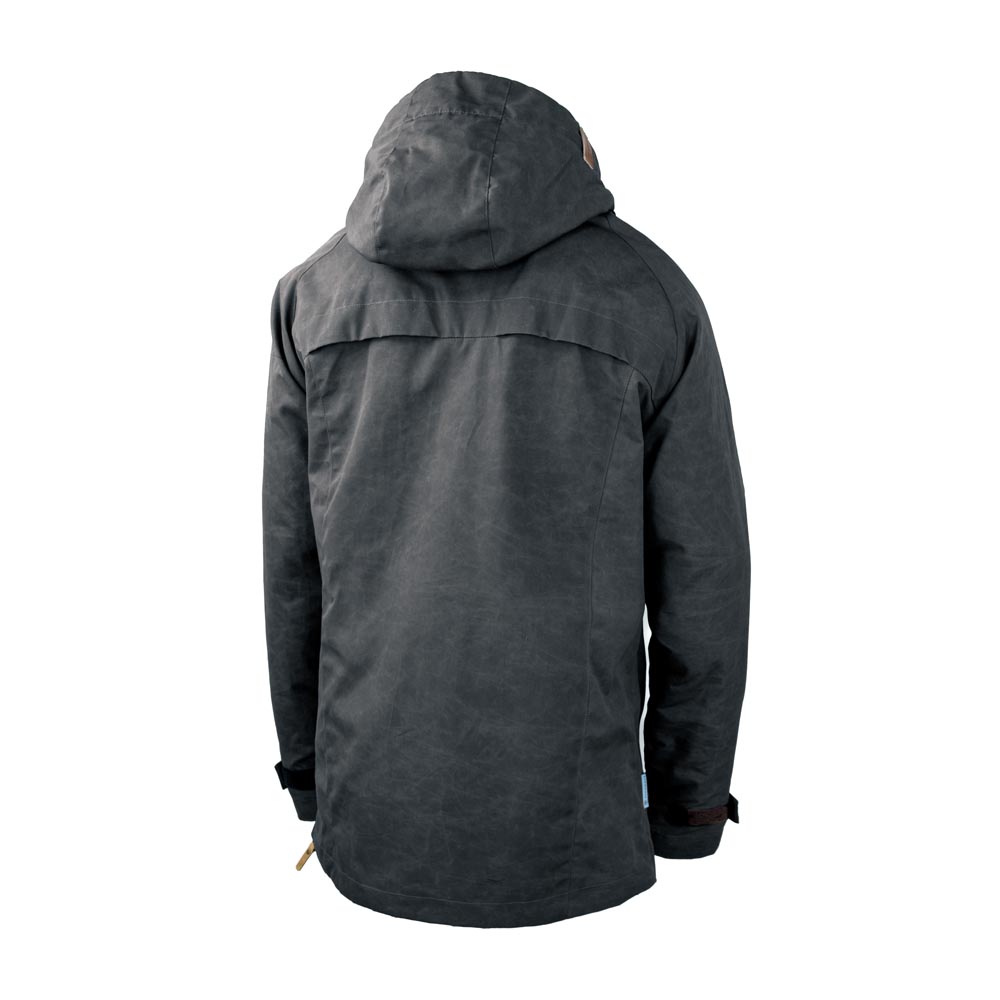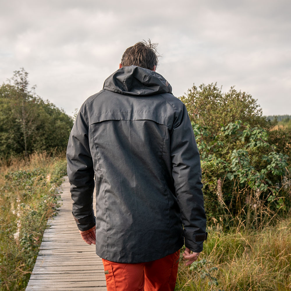 Das Innere der „Windfang“ ist mit einem dünnen Taschenfutter aus Polybaumwolle ausgekleidet, damit der gewachste Oberstoff keinen direkten Kontakt mit der übrigen Kleidung hat. Die Kapuze ist mit dem innen liegenden Kordelzug über zwei Achsen an die Kopfform anpassbar und lässt sich von locker bis eng anliegend tragen. Vier Außentaschen, zwei im Brust- und zwei mit seitlichem Eingriff im Hüftbereich, sind alle mit Reißverschluss versehen und zusätzlich mit einem Übertritt aus Waxcotton ausgestattet, der das Eindringen von Regentropfen erschweren soll. Im Inneren befindet sich auf beiden Seiten ebenfalls im Brustbereich je eine weitere Innentasche mit Reißverschluss und seitlichem Eingriff. Der Hauptreißverschluss ist aus brüniertem Metall und gleich mit zwei Stegen versehen, die unter und über dem Reißverschluss Wind- und Regen ausbremsen. Im Inneren der Ärmelbündchen und im Bund des Rumpfes sind Windfänge eingebaut. Das sind Stoffmanschetten, die mithilfe eines Kordelzuges verengt werden können, um das Eindringen von kaltem Wind zu verhindern und so die Jacke zusätzlich an empfindlichen Stellen abzuschotten. Darüber hinaus können die Ärmelbündchen auch noch mit einem außen liegenden Klettband enger gestellt werden.Hergestellt aus nachhaltigen Materialien