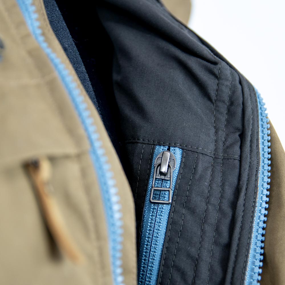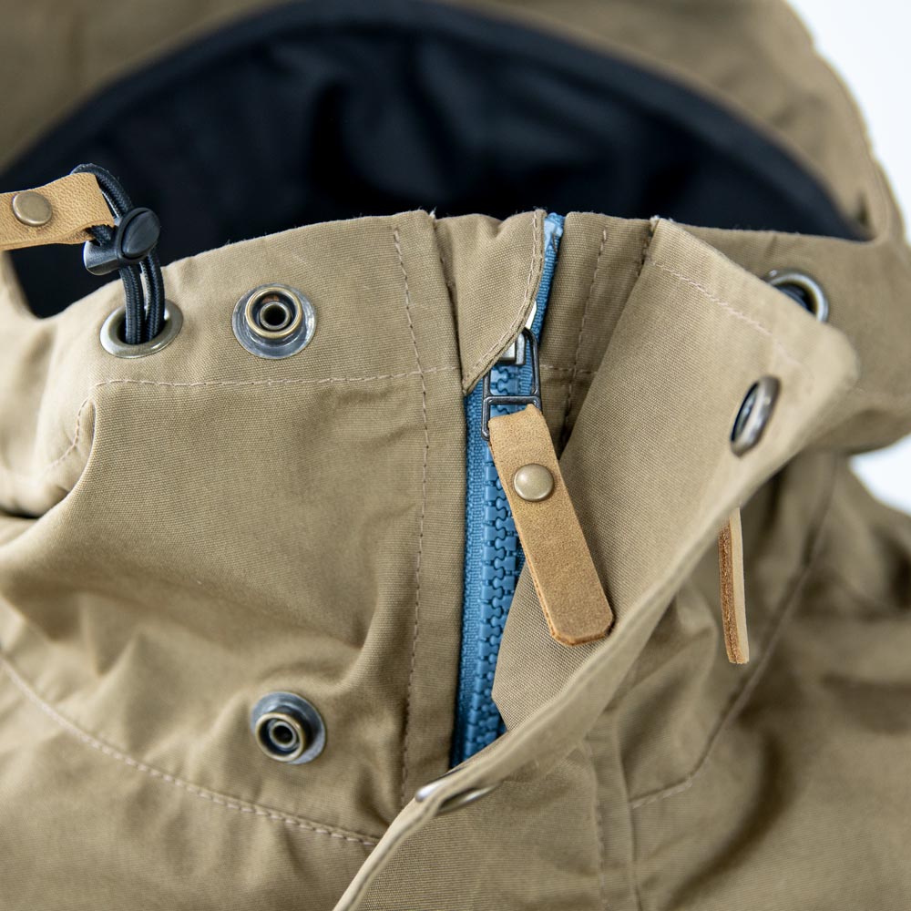 Das Innere der „Windfang“ ist mit einem dünnen Taschenfutter aus Polybaumwolle ausgekleidet, damit der gewachste Oberstoff keinen direkten Kontakt mit der übrigen Kleidung hat. Die Kapuze ist mit dem innen liegenden Kordelzug über zwei Achsen an die Kopfform anpassbar und lässt sich von locker bis eng anliegend tragen. Vier Außentaschen, zwei im Brust- und zwei mit seitlichem Eingriff im Hüftbereich, sind alle mit Reißverschluss versehen und zusätzlich mit einem Übertritt aus Waxcotton ausgestattet, der das Eindringen von Regentropfen erschweren soll. Im Inneren befindet sich auf beiden Seiten ebenfalls im Brustbereich je eine weitere Innentasche mit Reißverschluss und seitlichem Eingriff. Der Hauptreißverschluss ist aus brüniertem Metall und gleich mit zwei Stegen versehen, die unter und über dem Reißverschluss Wind- und Regen ausbremsen. Im Inneren der Ärmelbündchen und im Bund des Rumpfes sind Windfänge eingebaut. Das sind Stoffmanschetten, die mithilfe eines Kordelzuges verengt werden können, um das Eindringen von kaltem Wind zu verhindern und so die Jacke zusätzlich an empfindlichen Stellen abzuschotten. Darüber hinaus können die Ärmelbündchen auch noch mit einem außen liegenden Klettband enger gestellt werden.Hergestellt aus nachhaltigen Materialien