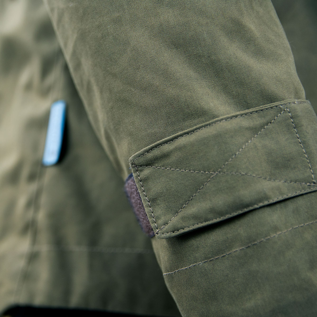 Das Innere der „Windfang“ ist mit einem dünnen Taschenfutter aus Polybaumwolle ausgekleidet, damit der gewachste Oberstoff keinen direkten Kontakt mit der übrigen Kleidung hat. Die Kapuze ist mit dem innen liegenden Kordelzug über zwei Achsen an die Kopfform anpassbar und lässt sich von locker bis eng anliegend tragen. Vier Außentaschen, zwei im Brust- und zwei mit seitlichem Eingriff im Hüftbereich, sind alle mit Reißverschluss versehen und zusätzlich mit einem Übertritt aus Waxcotton ausgestattet, der das Eindringen von Regentropfen erschweren soll. Im Inneren befindet sich auf beiden Seiten ebenfalls im Brustbereich je eine weitere Innentasche mit Reißverschluss und seitlichem Eingriff. Der Hauptreißverschluss ist aus brüniertem Metall und gleich mit zwei Stegen versehen, die unter und über dem Reißverschluss Wind- und Regen ausbremsen. Im Inneren der Ärmelbündchen und im Bund des Rumpfes sind Windfänge eingebaut. Das sind Stoffmanschetten, die mithilfe eines Kordelzuges verengt werden können, um das Eindringen von kaltem Wind zu verhindern und so die Jacke zusätzlich an empfindlichen Stellen abzuschotten. Darüber hinaus können die Ärmelbündchen auch noch mit einem außen liegenden Klettband enger gestellt werden.Hergestellt aus nachhaltigen Materialien