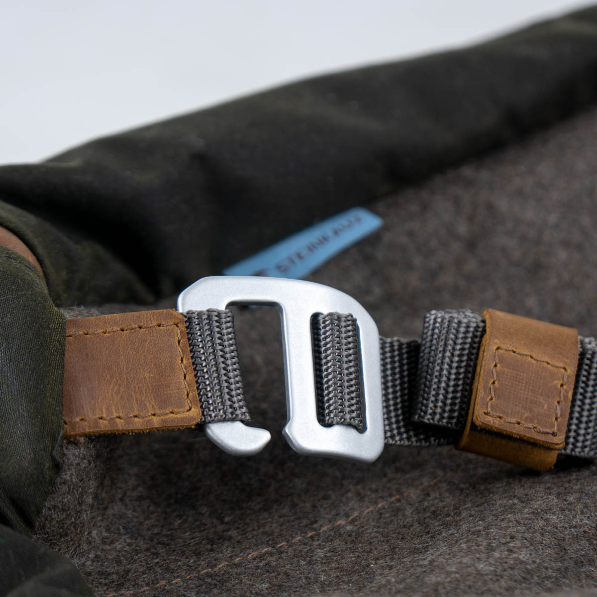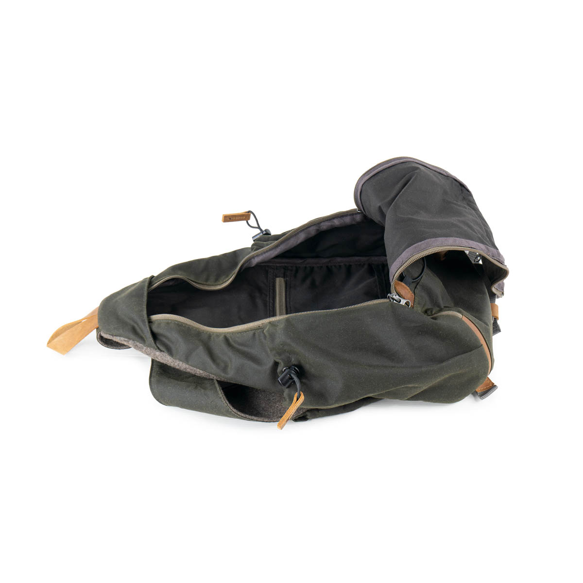 Die spitz zulaufende Form der Tasche erzeugt einen niedrigen Schwerpunkt und bringt zusammen mit dem griffigen Waxed Cotton ausreichend Stabilität auf den Rücken, so daß das Gepäck nicht auf dem Rücken hin- und herrutscht. Ein geschickt angelegter Aufbau ergibt neben dem Hauptfach mehrere zusätzliche Reißverschlußtaschen sowie Aussen- und Innenfächer. Am Trageriemen befindet sich zudem eine per Klettverschluss verschließbare Handytasche für den schnellen Zugriff auf Ihr Smartphone (für alle gängigen Smartphones) während des Tragens.