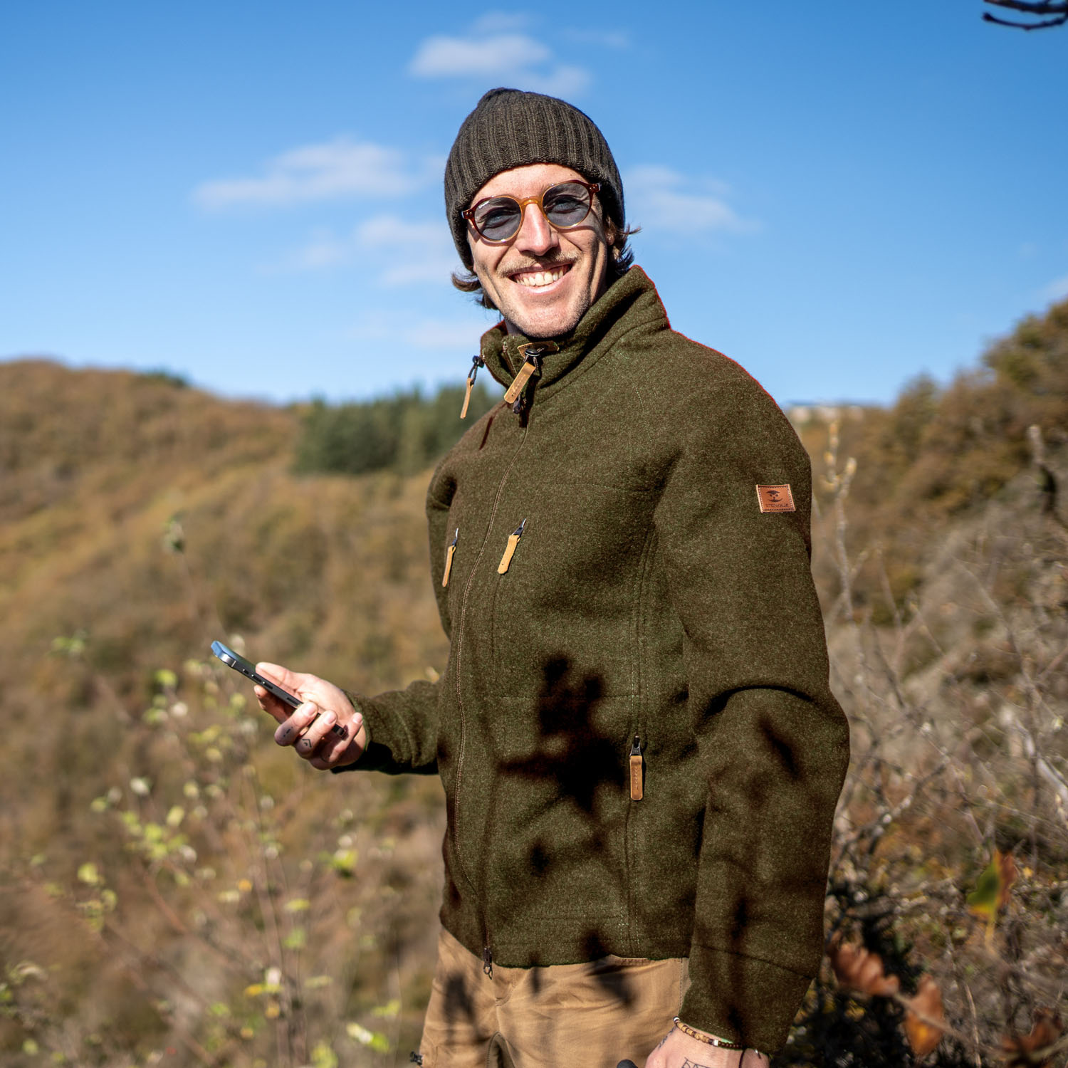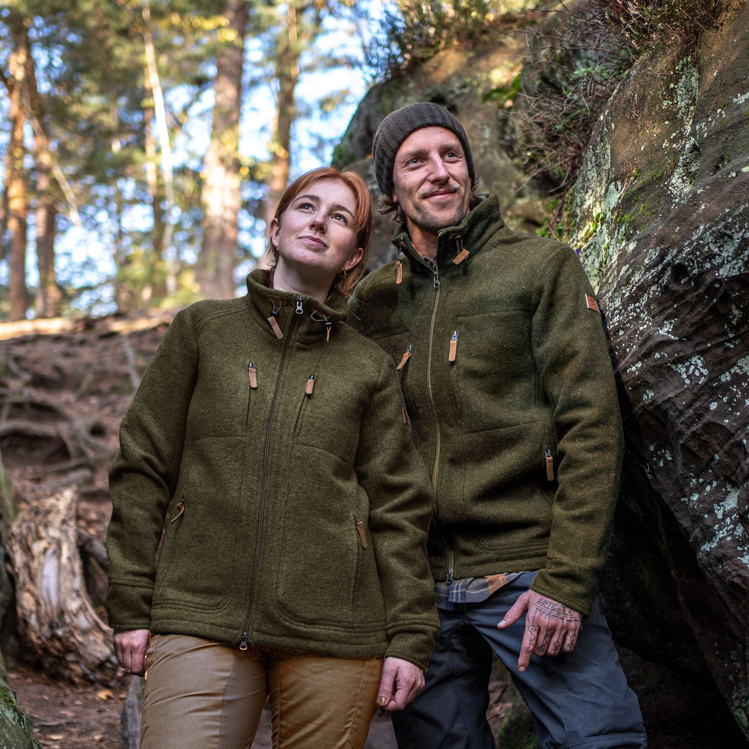 Unser Lodenfleece wird aus 100% reiner Schurwolle gefertigt, ist atmungsaktiv, wärmend und robust. Aufgrund des aufwändigen, beidseitigen Aufrauhungsverfahrens des Lodens ist der Stoff angenehm weich und hat einen hohen Tragekomfort. Das Naturprodukt Loden benötigt nicht viel Pflege: Gerüche verschwinden an der frischen Luft und Verschmutzungen läßt man trocknen und bürstet sie dann raus. Was unseren speziellen Lodenfleece aber ganz besonders macht, sind seine Klimaeigenschaften. Die dichte Webung des Doubleface-Lodens und der feine Flor auf der Oberfläche machen die Jacke nahezu resistent gegen das Eindringen von Wind – und das ganz ohne Membrane! Und genau deshalb, weil wir keine Membrane verbauen müssen, bleibt der Loden-Fleece auch noch sehr atmungsaktiv und sorgt für ein optimales Innenklima. In unseren FAQs gehen wir ausführlich auf das Thema Loden und seine Nutzung ein.
