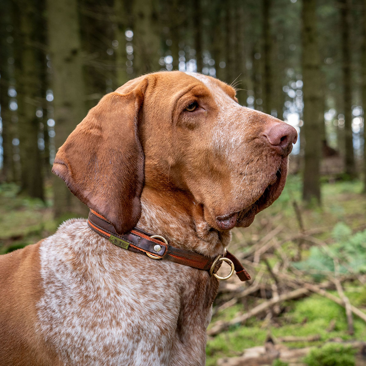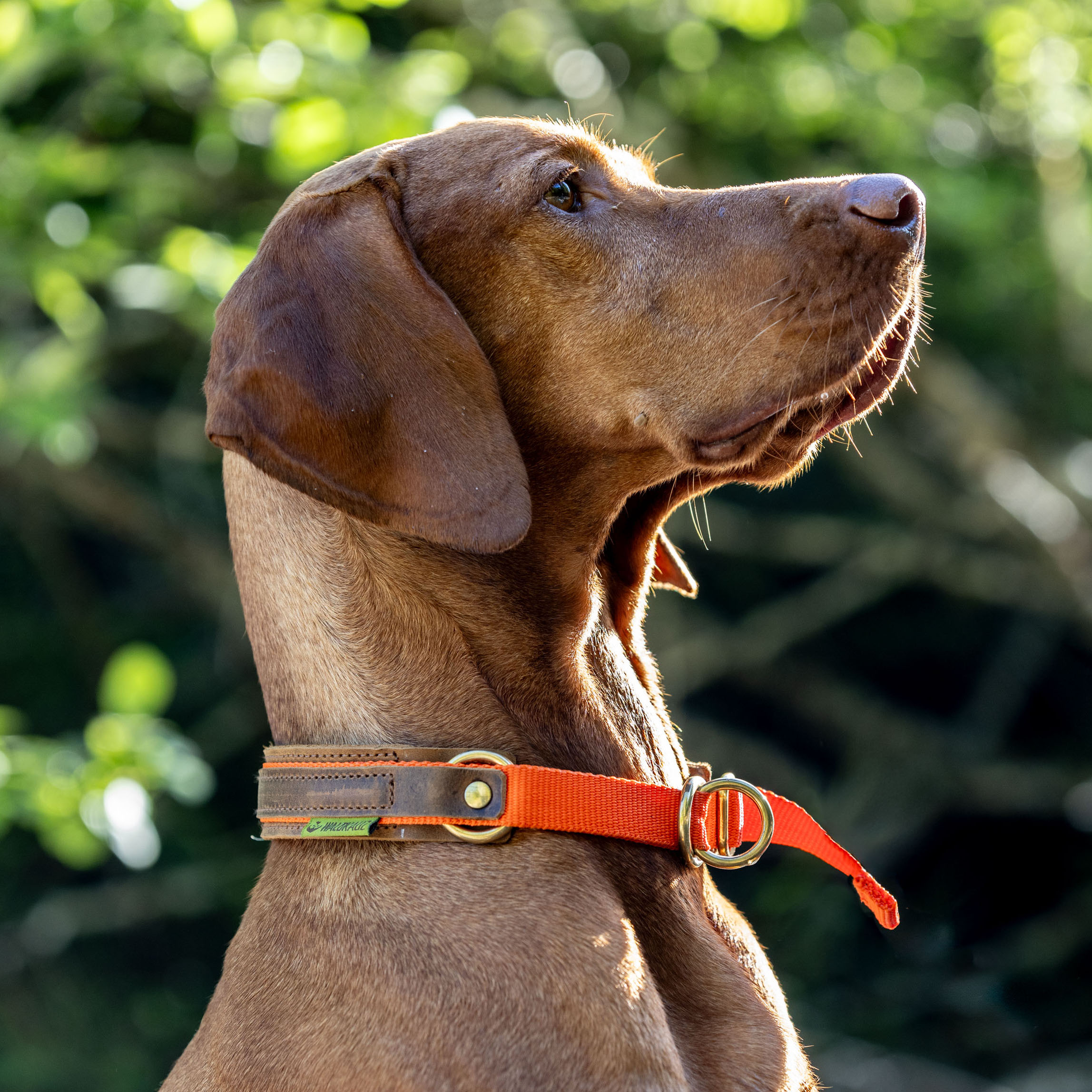 Zug-Stopp-Hundehalsung aus Gurtband und Fettnubukleder, erhältlich in vier Größen für fast alle Hunderassen.