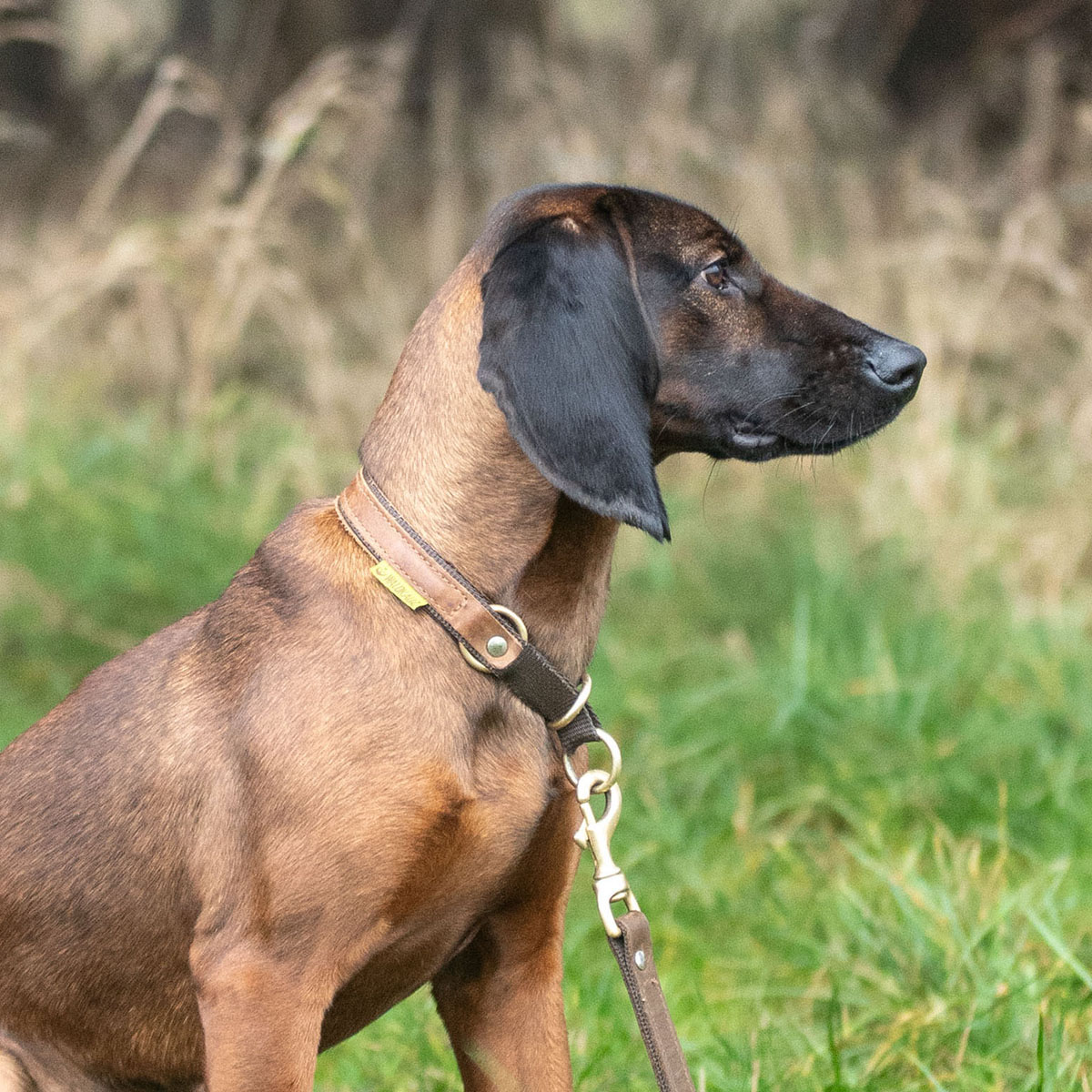 Zug-Stopp-Hundehalsung aus Gurtband und Fettnubukleder, erhältlich in vier Größen für fast alle Hunderassen.