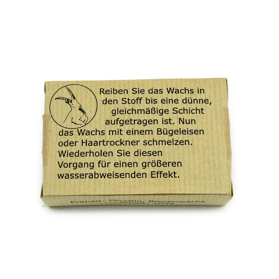 Dieses hochwertige Imprägnierwachs wird von einem kleinen deutschen Spezialisten für Wachsprodukte hergestellt und basiert auf einer Mischung aus Bienenwachs und Paraffin. Durch die richtige Rezeptur entsteht eine Konsistenz, die das Produkt gut auf unterschiedlichen Stoffen verarbeiten lässt. Es wird einfach, wie mit einem Radiergummi, auf den zu imprägnierenden Stoff aufgetragen und entweder mit dem Bügeleisen oder mit einem Fön auf dem Stoff erwärmt. Das Wachs zieht in den Stoff ein und bildet eine wasserabweisende Schicht.