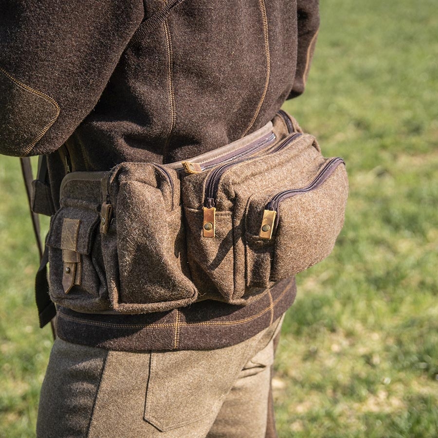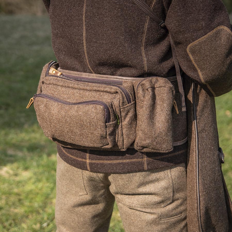 Diese voluminöse Hüfttasche oder Gürteltasche aus stabilem Gebirgsloden und Filz bietet Ihnen auf der Pirsch und auf langen Wanderungen ausreichend Platz für viel Jagdzubehör. In unterschiedlich großen Taschen können Sie all Ihren Jagdbedarf gut sortiert unterbringen und haben alles schnell zur Hand. Durch einen breiten Hüftgurt von etwa 77 cm Breite und 18 cm Höhe, auf den sämtliche Taschen aufgebracht sind, lässt sich die Hüfttasche auch voll bepackt sehr angenehm tragen. Im Gegensatz zu einem Jagdrucksack liegt das Gewicht nicht auf den Schultern, sondern auf den Hüften, was ein ermüdungsfreies Tragen, auch über längere Zeit, ermöglicht. Die praktische und aussergewöhnliche Jagdtasche wird mit einem Schnappverschluss schnell und leicht geöffnet und geschlossen. Die Zurrgurte ermöglichen es, die Hüfttasche sofort nach dem Anlegen optimal auf Spannung zu bringen und so einen stabilen und angenehmen Sitz zu gewährleisten. Sie können die Tasche hinten am Körper befestigen oder, zum Beispiel beim Ansitz, auch vor dem Bauch tragen. In sitzender Position auf dem Hochsitz hat man nicht nur einen wärmenden Filzgurt vor dem Bauch, sondern auch alles Jagdzubehör direkt zur Hand.