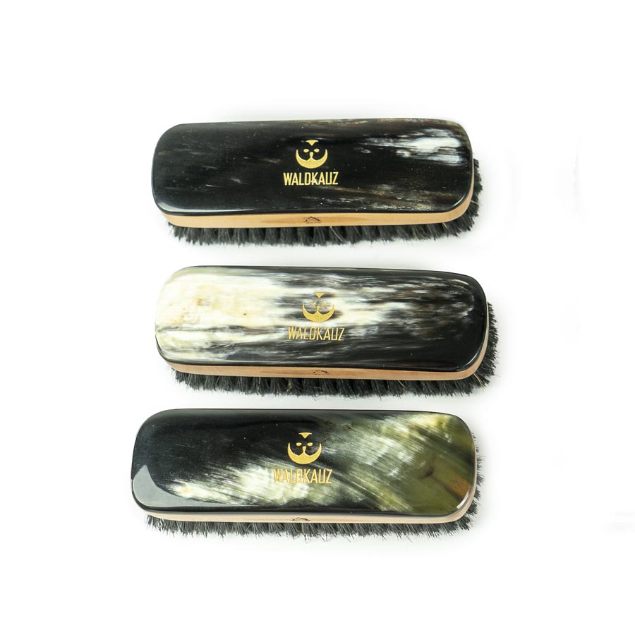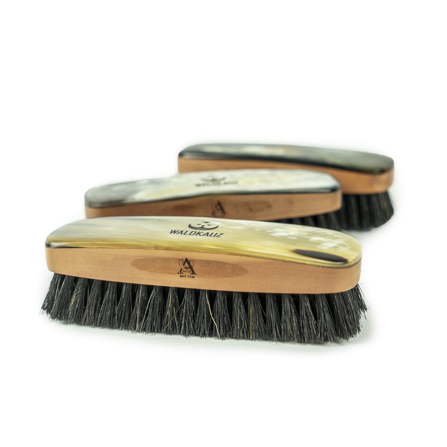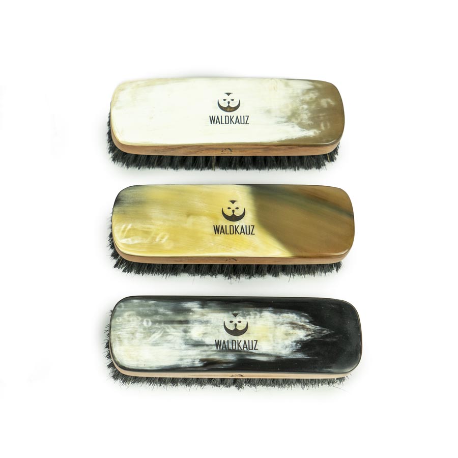 Da das Rinderhorn sehr unterschiedlich ausfällt, gleicht keine Bürste der anderen – jedes Exemplar ist ein absolutes Unikat. Die abgebildeten Bürsten stehen also beispielhaft für die große Vielfalt an unterschiedlichen Oberflächen.