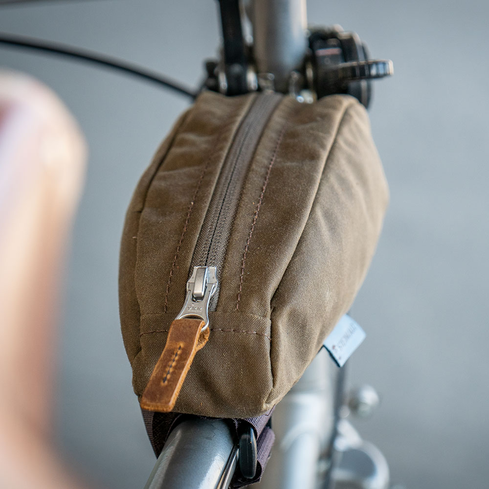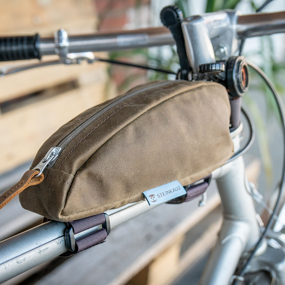 Unsere Pedalist Fahrradtaschen-Kollektion aus Waxed Cotton macht aus jedem noch so handelsüblichen Fahrrad einen echten Individualisten! Dieses praktische, kleine Etui wird an der Herrenrad-Stange angebracht. Es dient zur Aufbewahrung von Kleinigkeiten wie z. B. Handy, Portemonnaie, Schlüsselbund oder einem kleinem Fahrradschloss. Die Befestigung erfolgt mit Klettbändern, die an die Stange Ihres Radls angepasst und dann abgeschnitten werden.