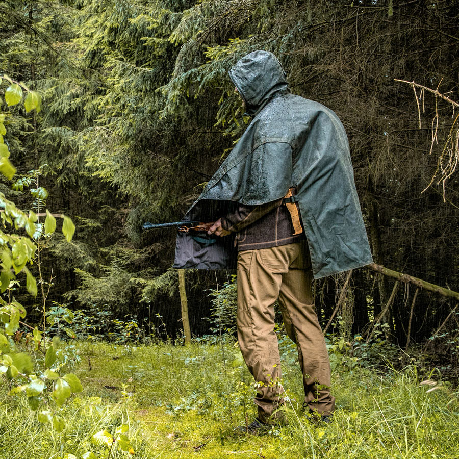Handfestes Regencape für echtes Sauwetter aus englischem Waxcotton, das nicht nur Jägern die Scheu vor verregneten Tagen und Schlechtwetter-Drückjagden nimmt.