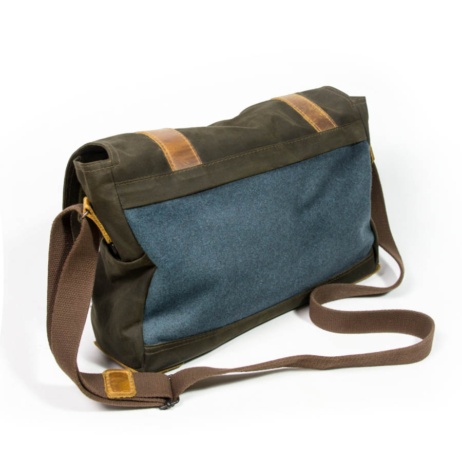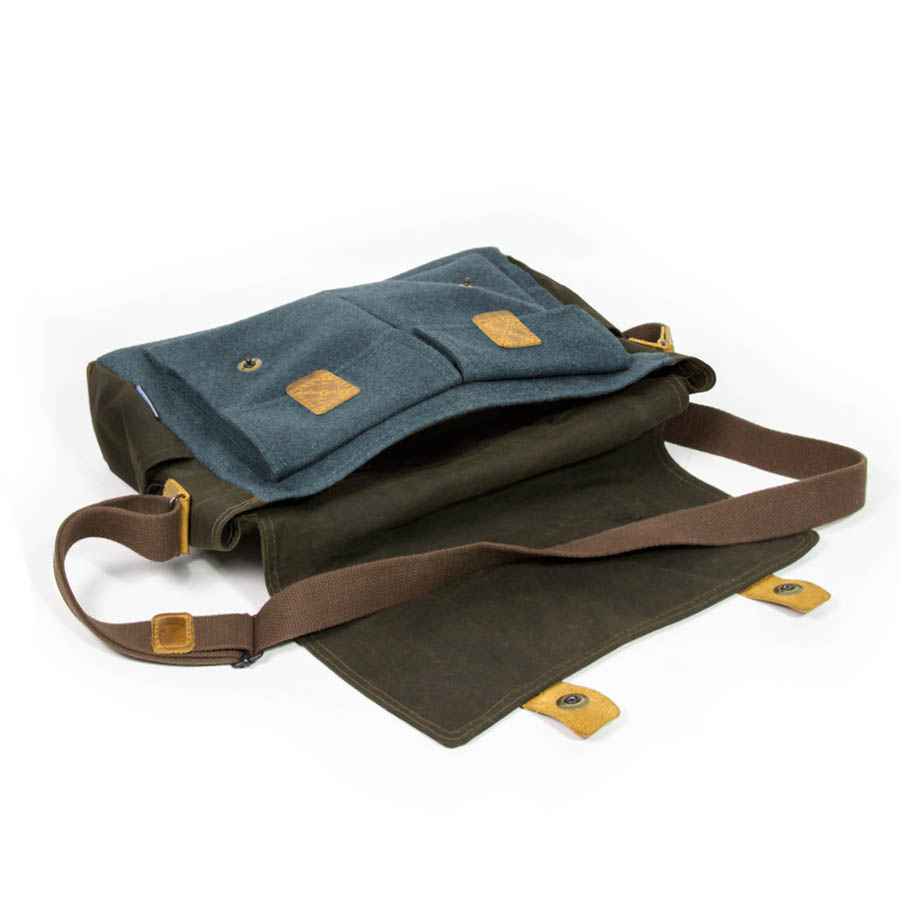 Geräumige Umhängetasche vom STEINKAUZ aus langlebigem und robustem Waxed Cotton, Loden und Leder.